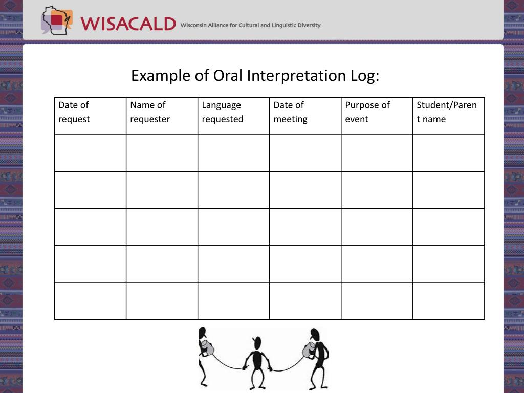 Example of Written Translation Log: Requests for written translation must be submitted in advance of the due date to allow time for Language Support Services staff to complete the document with accuracy. (Two weeks advance notice is preferred to ensure ample time for the translation process.) Translated documents should be disseminated at the same time the English versions are shared.