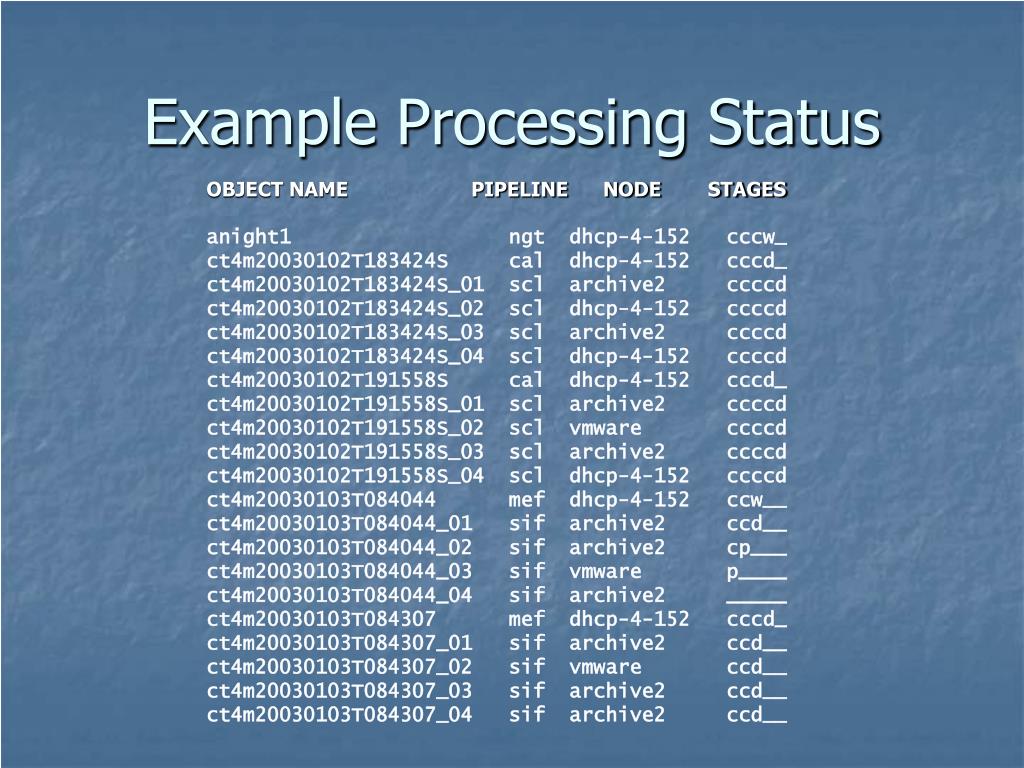 Example Processing Status OBJECT NAME PIPELINE NODE STAGES anight1 ngt dhcp-4-152 cccw_ct4m20030102T183424S cal dhcp-4-152 cccd_ct4m20030102T183424S_01 scl archive2 ccccdct4m20030102T183424S_02 scl dhcp-4-152 ccccdct4m20030102T183424S_03 scl archive2 ccccdct4m20030102T183424S_04 scl dhcp-4-152 ccccdct4m20030102T191558S cal dhcp-4-152 cccd_ct4m20030102T191558S_01 scl archive2 ccccdct4m20030102T191558S_02 scl vmware ccccdct4m20030102T191558S_03 scl archive2 ccccdct4m20030102T191558S_04 scl dhcp-4-152 ccccdct4m20030103T084044 mef dhcp-4-152 ccw__ct4m20030103T084044_01 sif archive2 ccd__ct4m20030103T084044_02 sif archive2 cp___ct4m20030103T084044_03 sif vmware p____ct4m20030103T084044_04 sif archive2 _____ct4m20030103T084307 mef dhcp-4-152 cccd_ct4m20030103T084307_01 sif archive2 ccd__ct4m20030103T084307_02 sif vmware ccd__ct4m20030103T084307_03 sif archive2 ccd__ct4m20030103T084307_04 sif archive2 ccd__
