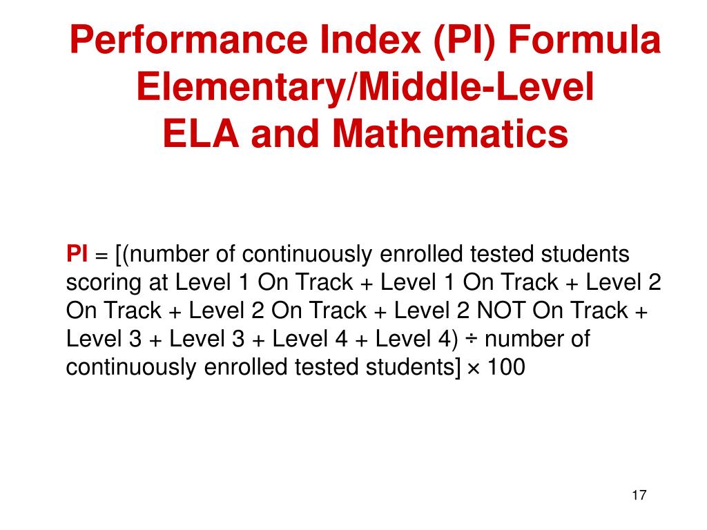 Performance Index (PI) FormulaElementary/Middle-LevelELA and Mathematics PI = [(number of continuously enrolled tested students scoring at Level 1 On Track + Level 1 On Track + Level 2 On Track + Level 2 On Track + Level 2 NOT On Track + Level 3 + Level 3 + Level 4 + Level 4) ÷ number of continuously enrolled tested students] 100