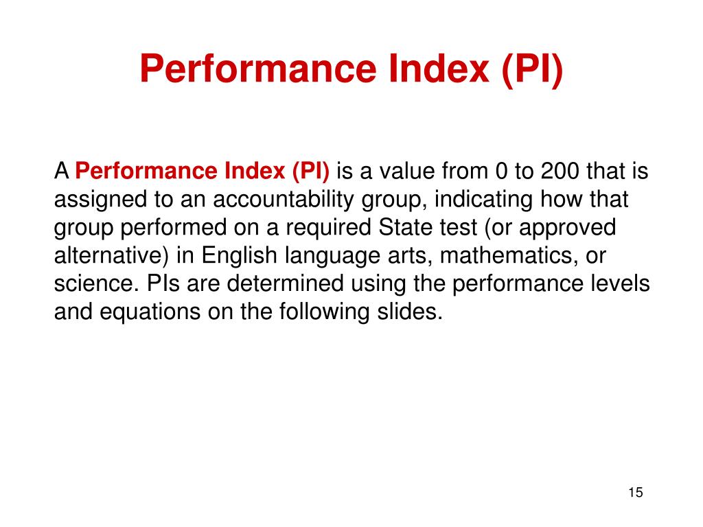 Performance Index (PI) A Performance Index (PI) is a value from 0 to 200 that is assigned to an accountability group, indicating how that group performed on a required State test (or approved alternative) in English language arts, mathematics, or science. PIs are determined using the performance levels and equations on the following slides. 15