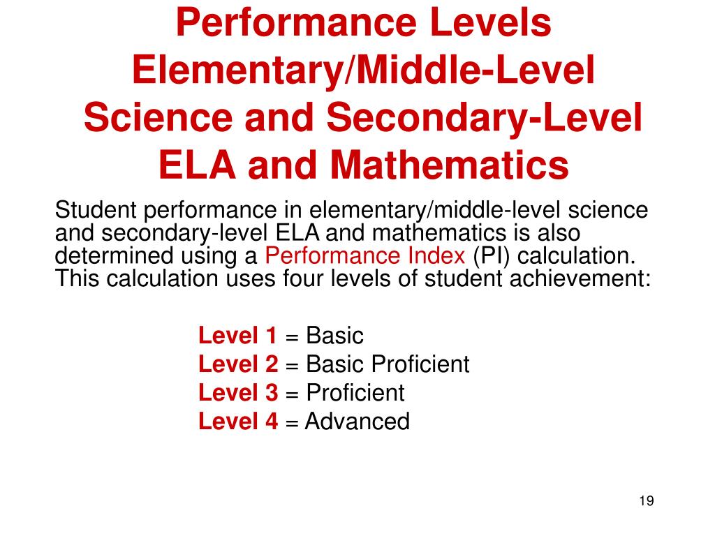 Performance Levels Elementary/Middle-Level Science and Secondary-Level ELA and Mathematics Student performance in elementary/middle-level science and secondary-level ELA and mathematics is also determined using a Performance Index (PI) calculation. This calculation uses four levels of student achievement: Level 1 = Basic Level 2 = Basic Proficient Level 3= Proficient Level 4 = Advanced 19