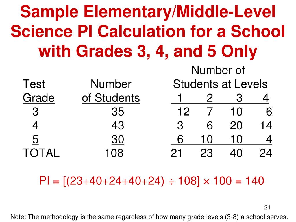 Performance Index (PI) FormulaElementary/Middle-Level Science and Secondary-Level ELA and Mathematics Elementary/Middle Level Science: PI = [(number of continuously enrolled tested students scoring at Levels 2, 3, and 4 + the number scoring at Levels 3 and 4) ÷ number of continuously enrolled tested students] 100 Secondary Level ELA and Mathematics: PI = [(number of cohort members scoring at Levels 2, 3, and 4 + the number scoring at Levels 3 and 4) ÷ number of cohort members] 100 20