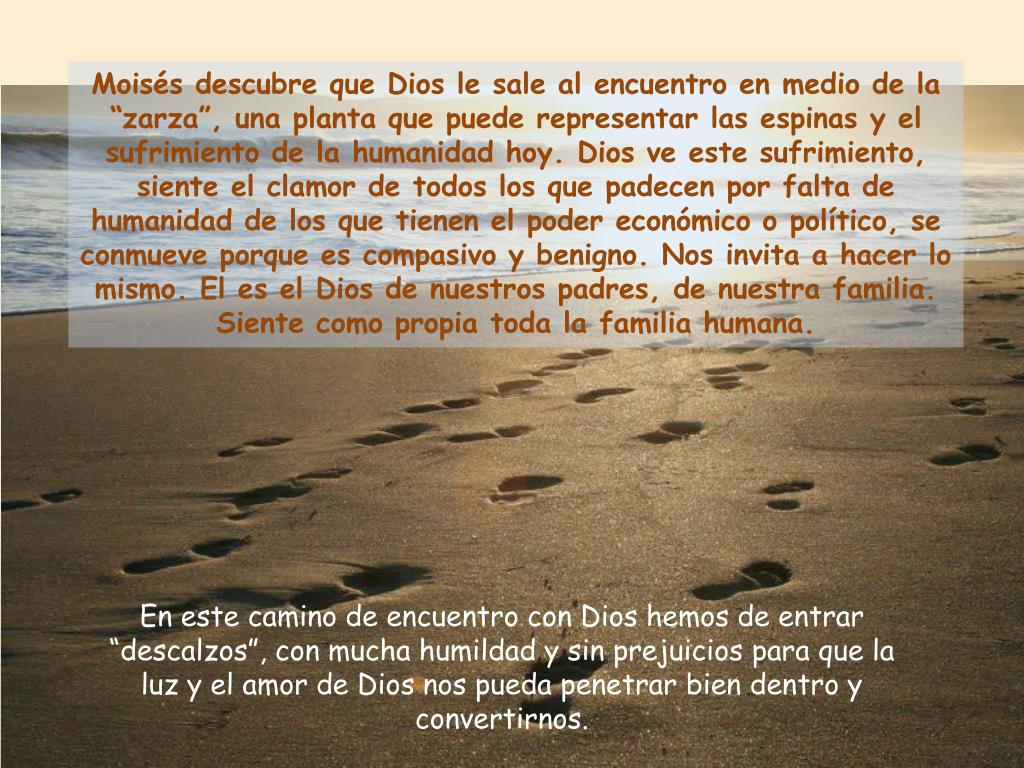 Moisés descubre que Dios le sale al encuentro en medio de la “zarza”, una planta que puede representar las espinas y el sufrimiento de la humanidad hoy. Dios ve este sufrimiento, siente el clamor de todos los que padecen por falta de humanidad de los que tienen el poder económico o político, se conmueve porque es compasivo y benigno. Nos invita a hacer lo mismo. El es el Dios de nuestros padres, de nuestra familia. Siente como propia toda la familia humana. • En este camino de encuentro con Dios hemos de entrar “descalzos”, con mucha humildad y sin prejuicios para que la luz y el amor de Dios nos pueda penetrar bien dentro y convertirnos.