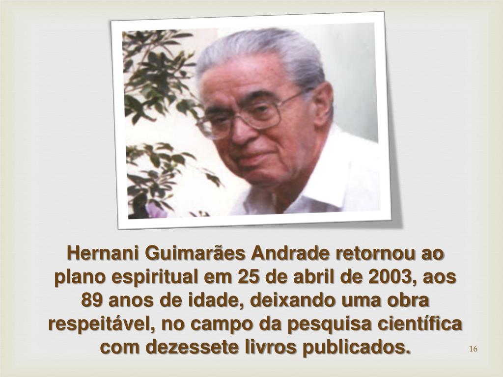 Biografia • Após estudar, exaustivamente as obras clássicas da Doutrina Espírita, tais como os autores: Delanne, Denis, Bozzano, Flammarion, Crookes, Aksakoff, Richet, Crawford, Lombroso, de Rochas e tantos outros; • Examinou os experimentos e as teorias dos Metapsiquistas e dos Parapsicólogos, na busca da realidade e da essencialidade do espírito. • Possuía conhecimentos aprofundados de Física e de diversos aspectos das Ciências Biológicas, da Cosmologia, da Estatística e da Psicologia. • Tinha apreciável domínio de várias disciplinas filosóficas, principalmente aquelas mais relacionadas com a Ciência (Lógica, Epistemologia, Metodologia de Pesquisa, Gnosiologia). Hernâni Guimarães