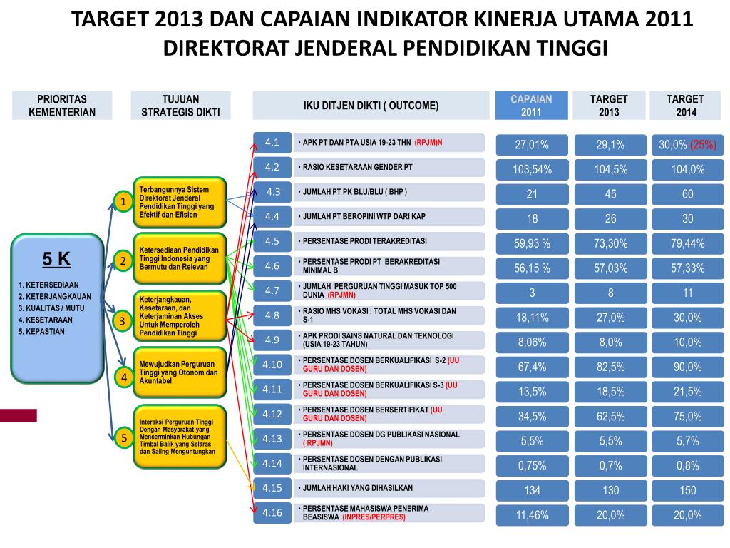 TARGET 2013 DAN CAPAIAN INDIKATOR KINERJA UTAMA 2011 DIREKTORAT JENDERAL PENDIDIKAN TINGGI TUJUAN STRATEGIS DIKTI IKU DITJEN DIKTI ( OUTCOME) TARGET 2013 PRIORITAS KEMENTERIAN CAPAIAN 2011 TARGET 2014 1 5 K 2 3 4 5