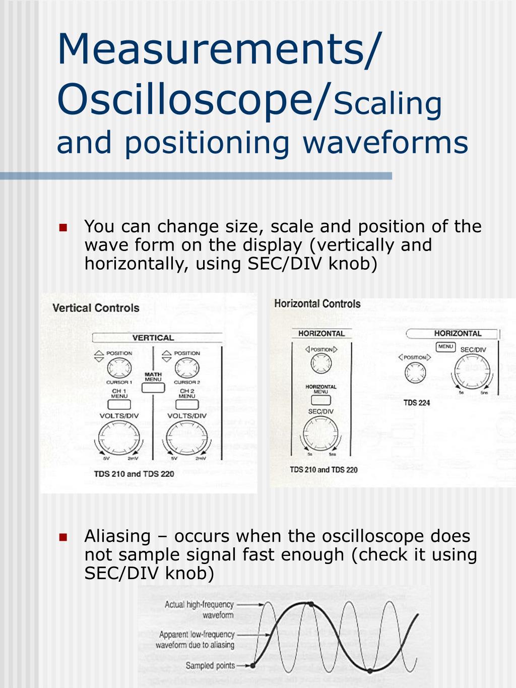 Measurements/ Oscilloscope/Scaling and positioning waveforms • You can change size, scale and position of the wave form on the display (vertically and horizontally, using SEC/DIV knob) • Aliasing – occurs when the oscilloscope does not sample signal fast enough (check it using SEC/DIV knob)