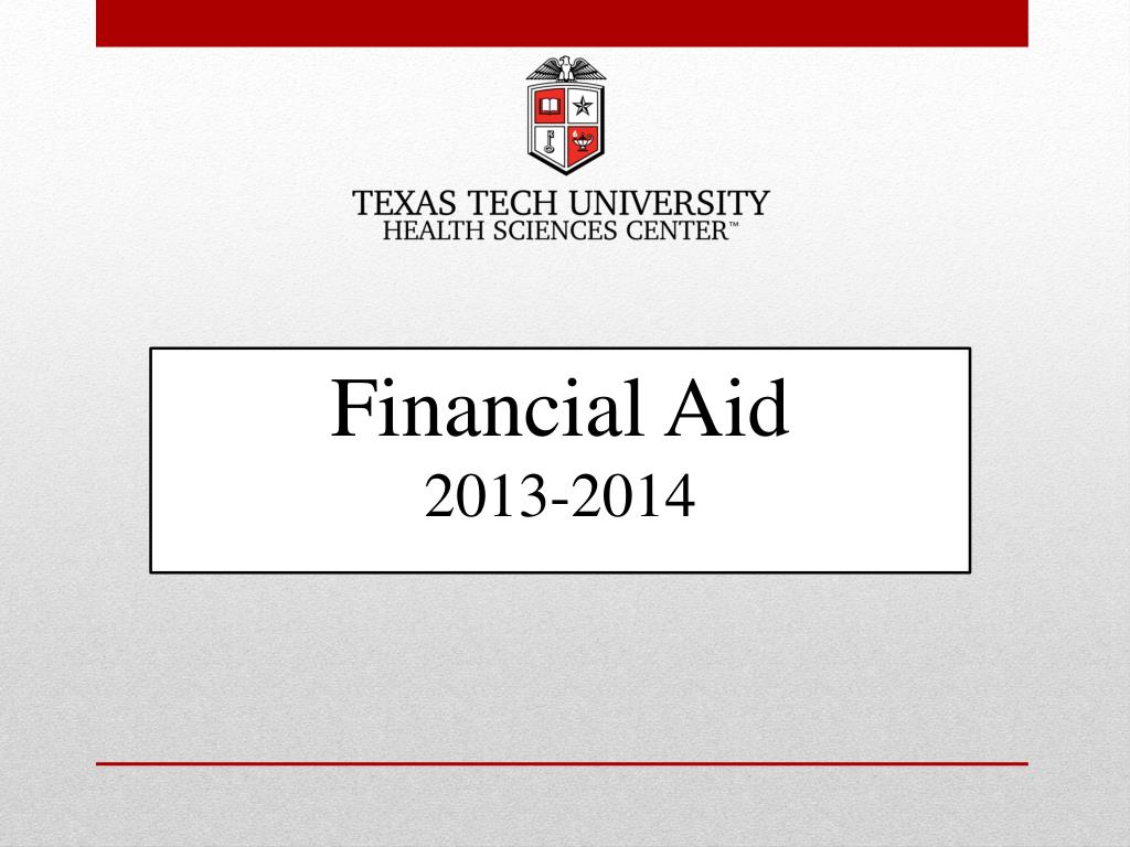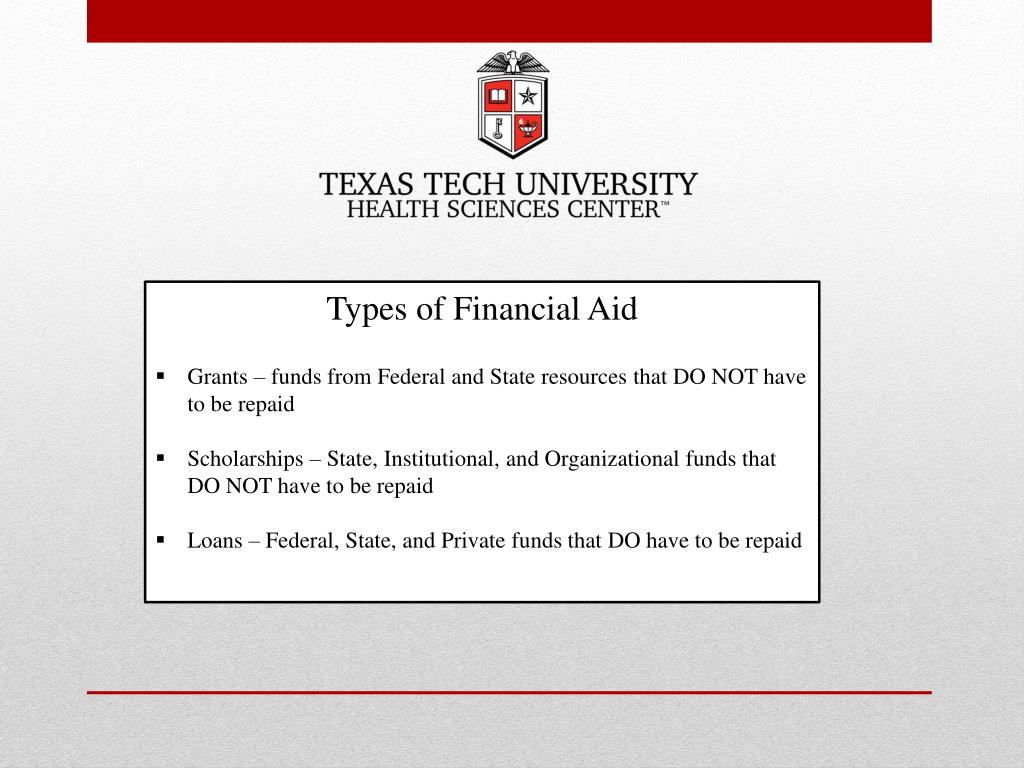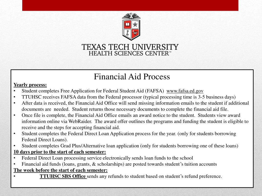 Financial Aid Process • Yearly process: • Student completes Free Application for Federal Student Aid (FAFSA) www.fafsa.ed.gov • TTUHSC receives FAFSA data from the Federal processor (typical processing time is 3-5 business days) • After data is received, the Financial Aid Office will send missing information emails to the student if additional documents are needed. Student returns those necessary documents to complete the financial aid file. • Once file is complete, the Financial Aid Office emails an award notice to the student. Students view award information online via WebRaider. The award offer outlines the programs and funding the student is eligible to receive and the steps for accepting financial aid. • Student completes the Federal Direct Loan Application process for the year. (only for students borrowing Federal Direct Loans). • Student completes Grad Plus/Alternative loan application (only for students borrowing one of these loans) • 10 days prior to the start of each semester: • Federal Direct Loan processing service electronically sends loan funds to the school • Financial aid funds (loans, grants, & scholarships) are posted towards student’s tuition accounts • The week before the start of each semester: • TTUHSC SBS Office sends any refunds to student based on student’s refund preference.