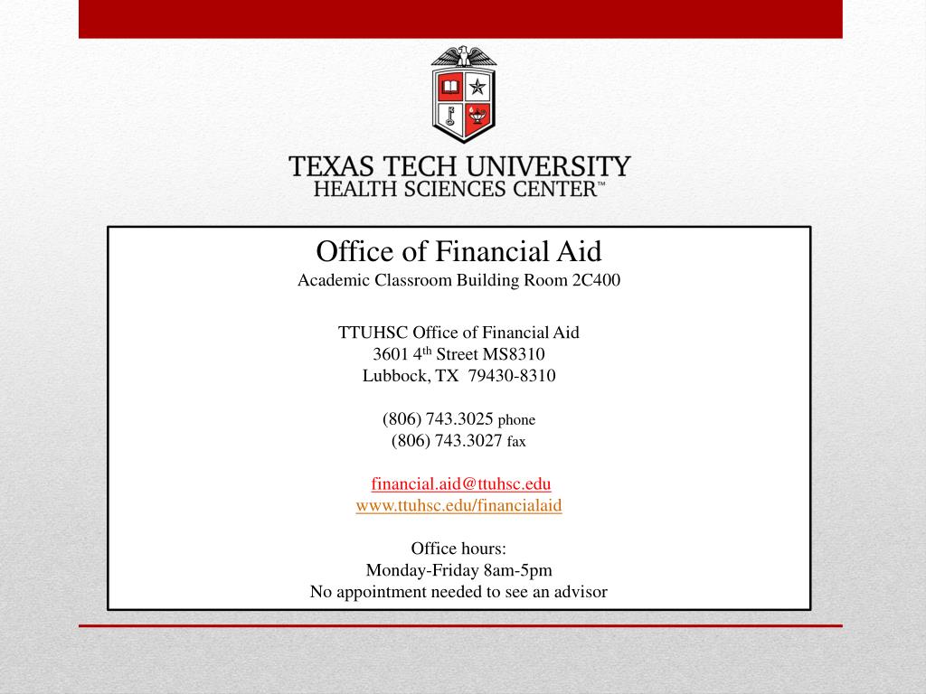 Office of Financial Aid Academic Classroom Building Room 2C400 TTUHSC Office of Financial Aid 3601 4th Street MS8310 Lubbock, TX 79430-8310 (806) 743.3025 phone (806) 743.3027 fax financial.aid@ttuhsc.edu www.ttuhsc.edu/financialaid Office hours: Monday-Friday 8am-5pm No appointment needed to see an advisor
