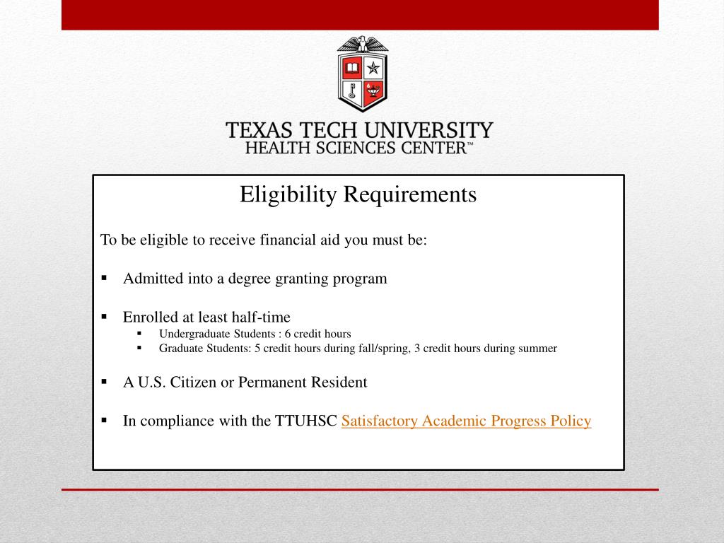 Eligibility Requirements • To be eligible to receive financial aid you must be: • Admitted into a degree granting program • Enrolled at least half-time • Undergraduate Students : 6 credit hours • Graduate Students: 5 credit hours during fall/spring, 3 credit hours during summer • A U.S. Citizen or Permanent Resident • In compliance with the TTUHSC Satisfactory Academic Progress Policy