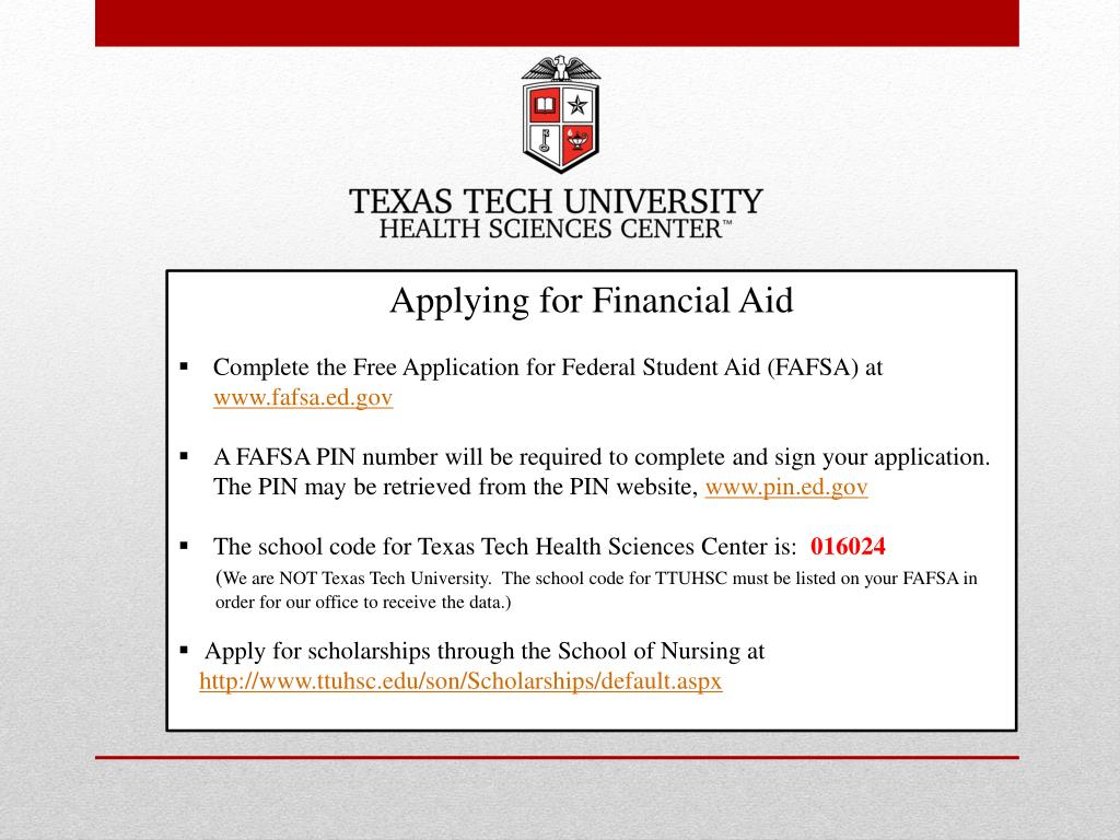 Applying for Financial Aid • Complete the Free Application for Federal Student Aid (FAFSA) at www.fafsa.ed.gov • A FAFSA PIN number will be required to complete and sign your application. The PIN may be retrieved from the PIN website, www.pin.ed.gov • The school code for Texas Tech Health Sciences Center is: 016024 • (We are NOT Texas Tech University. The school code for TTUHSC must be listed on your FAFSA in • order for our office to receive the data.) • Apply for scholarships through the School of Nursing at http://www.ttuhsc.edu/son/Scholarships/default.aspx