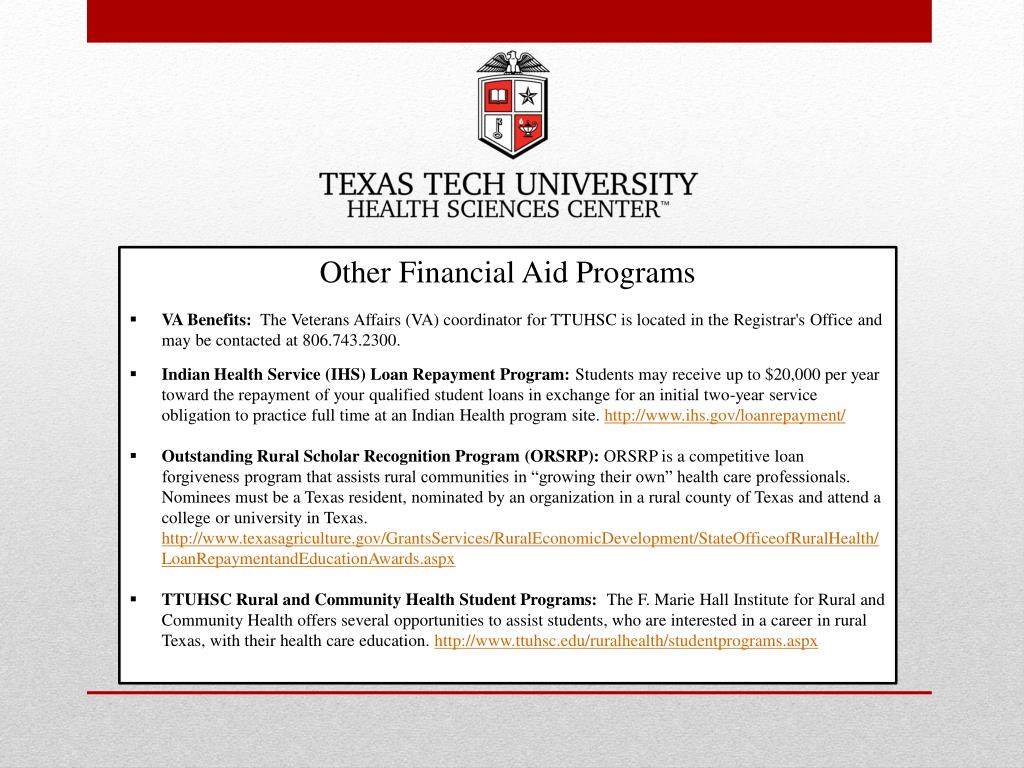 Other Financial Aid Programs • VA Benefits: The Veterans Affairs (VA) coordinator for TTUHSC is located in the Registrar's Officeand may be contacted at 806.743.2300. • Indian Health Service (IHS) Loan Repayment Program: Students may receive up to $20,000 per year toward the repayment of your qualified student loans in exchange for an initial two-year service obligation to practice full time at an Indian Health program site. http://www.ihs.gov/loanrepayment/ • Outstanding Rural Scholar Recognition Program (ORSRP): ORSRP is a competitive loan forgiveness program that assists rural communities in “growing their own” health care professionals. Nominees must be a Texas resident, nominated by an organization in a rural county of Texas and attend a college or university in Texas.http://www.texasagriculture.gov/GrantsServices/RuralEconomicDevelopment/StateOfficeofRuralHealth/LoanRepaymentandEducationAwards.aspx • TTUHSC Rural and Community Health Student Programs: The F. Marie Hall Institute for Rural and Community Health offers several opportunities to assist students, who are interested in a career in rural Texas, with their health care education. http://www.ttuhsc.edu/ruralhealth/studentprograms.aspx