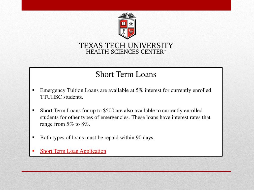 Short Term Loans • Emergency Tuition Loans are available at 5% interest for currently enrolled TTUHSC students. • Short Term Loans for up to $500 are also available to currently enrolled students for other types of emergencies. These loans have interest rates that range from 5% to 8%. • Both types of loans must be repaid within 90 days. • Short Term Loan Application