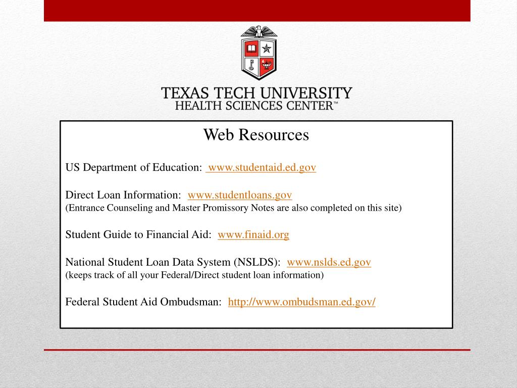 Web Resources US Department of Education: www.studentaid.ed.gov Direct Loan Information: www.studentloans.gov(Entrance Counseling and Master Promissory Notes are also completed on this site) Student Guide to Financial Aid: www.finaid.org National Student Loan Data System (NSLDS): www.nslds.ed.gov(keeps track of all your Federal/Direct student loan information) Federal Student Aid Ombudsman: http://www.ombudsman.ed.gov/