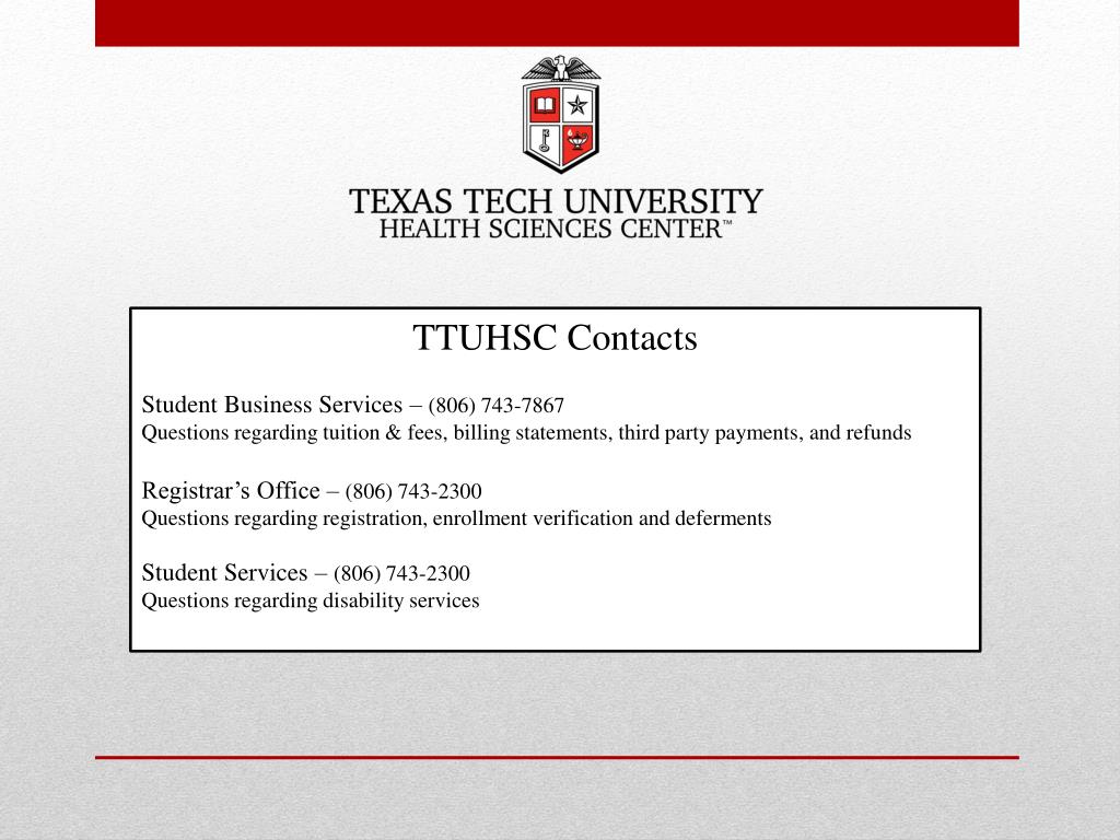 TTUHSC Contacts Student Business Services – (806) 743-7867 Questions regarding tuition & fees, billing statements, third party payments, and refunds Registrar’s Office – (806) 743-2300 Questions regarding registration, enrollment verification and deferments Student Services – (806) 743-2300 Questions regarding disability services