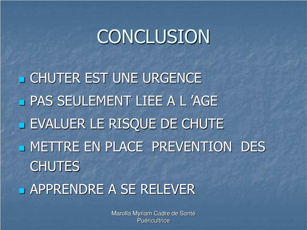 CONCLUSION • CHUTER EST UNE URGENCE • PAS SEULEMENT LIEE A L ’AGE • EVALUER LE RISQUE DE CHUTE • METTRE EN PLACE PREVENTION DES CHUTES • APPRENDRE A SE RELEVER Marolla Myriam Cadre de Santé Puéricultrice