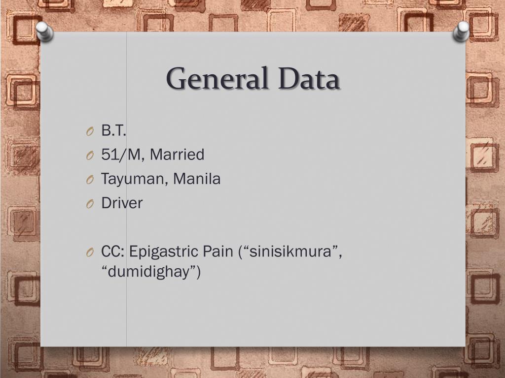 General Data • B.T. • 51/M, Married • Tayuman, Manila • Driver • CC: Epigastric Pain (“sinisikmura”, “dumidighay”)