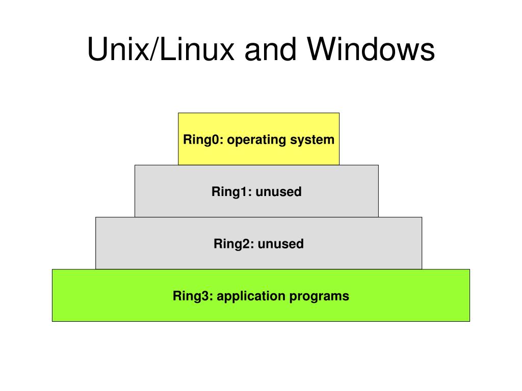 Unix/Linux and Windows Ring0: operating system Ring1: unused Ring2: unused Ring3: application programs