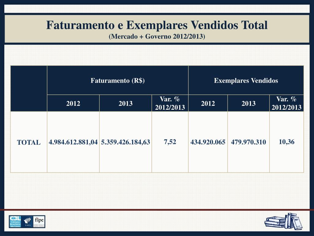 Faturamento e Exemplares Vendidos Total • (Mercado + Governo 2012/2013)