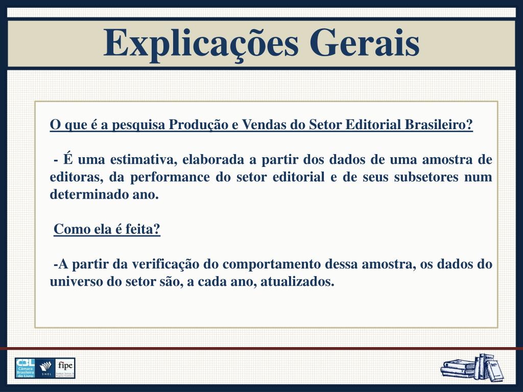 Explicações Gerais O que é a pesquisa Produção e Vendas do Setor Editorial Brasileiro? - É uma estimativa, elaborada a partir dos dados de uma amostra de editoras, da performance do setor editorial e de seus subsetores num determinado ano. Como ela é feita? -A partir da verificação do comportamento dessa amostra, os dados do universo do setor são, a cada ano, atualizados.