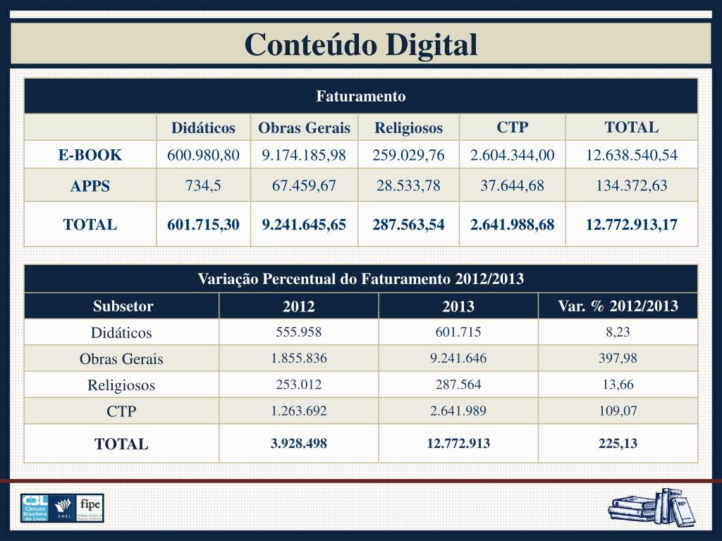 Explicações Gerais • O crescimento nominal do setor editorial brasileiro em 2013 foi de 7,52%. • Esse percentual significa um crescimento real de 1,52%, considerada a variação de 5,91% do IPCA em 2013. • Contudo, desconsideradas as compras feitas pelo governo, o crescimento nominal foi de 5,90%. Ou seja, considerada a variação do IPCA de 5,91%, as vendas apenas ao mercado apresentaram crescimento real de praticamente 0%. • O número total de exemplares vendidos cresceu 4,13% se considerarmos apenas as vendas ao Mercado e 20,41% se considerarmos as vendas ao Governo. • Isso significa que o preço médio corrente do livro cresceu 1,70% em 2013 considerando apenas as vendas ao Mercado. Porém, se considerada a variação do IPCA de 5,91%, o preço médio constante do livro apresentou uma queda de -4,0%. • A venda de e-books aumentou 225,13 % de 2012 para 2013, contudo ainda representa uma parcela muito pequena do faturamento total do setor.