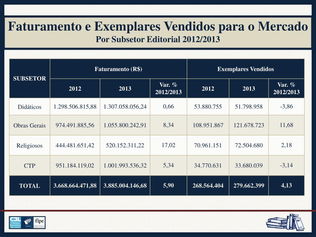 Faturamento e Exemplares Vendidos para o Mercado • Por Subsetor Editorial 2012/2013