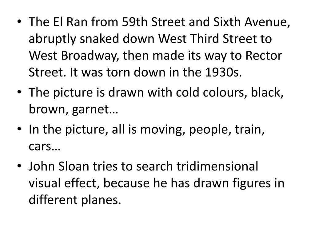 The El Ran from 59th Street and Sixth Avenue, abruptly snaked down West Third Street to West Broadway, then made its way to Rector Street. It was torn down in the 1930s. • The picture is drawn with cold colours, black, brown, garnet… • In the picture, all is moving, people, train, cars… • John Sloan tries to search tridimensional visual effect, because he has drawn figures in different planes.