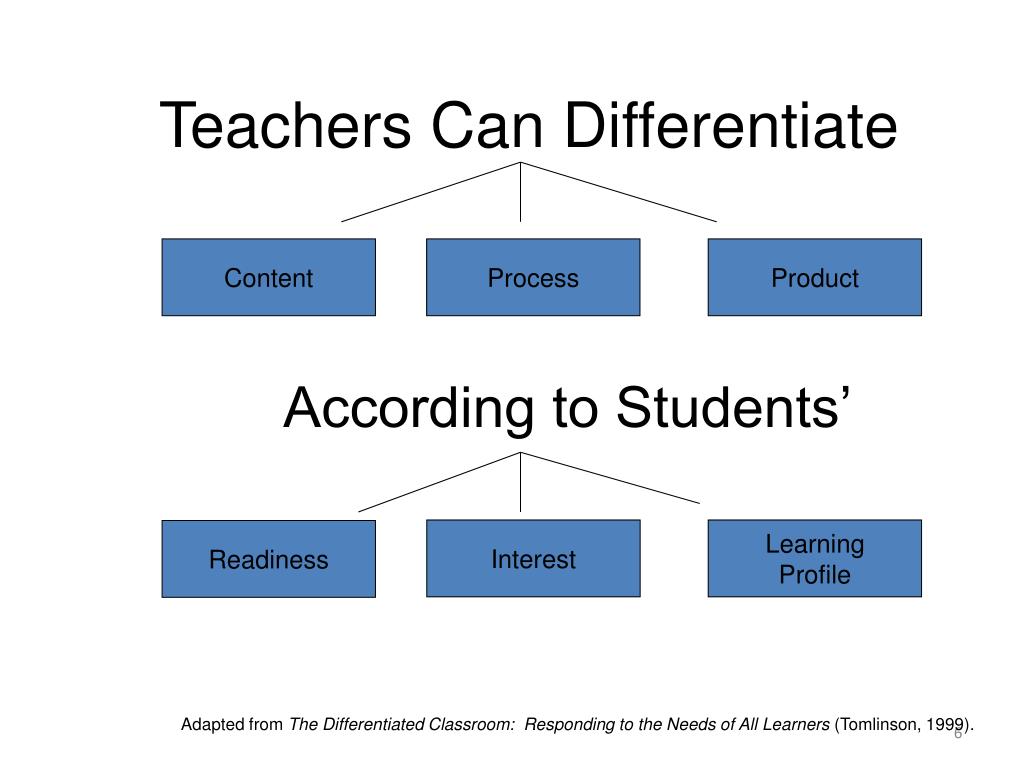 Teachers Can Differentiate Content Process Product According to Students’ Interest Learning Profile Readiness Adapted from The Differentiated Classroom: Responding to the Needs of All Learners (Tomlinson, 1999).