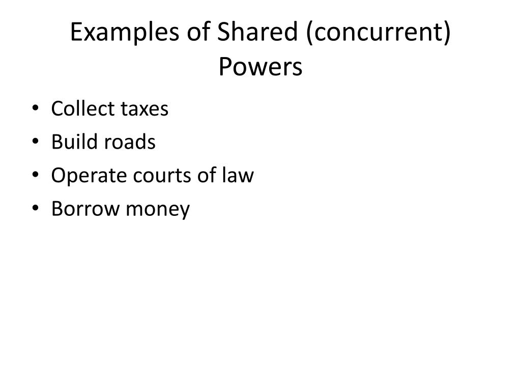 Examples of Shared (concurrent) Powers • Collect taxes • Build roads • Operate courts of law • Borrow money