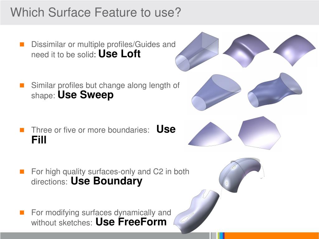 Which Surface Feature to use? • Dissimilar or multiple profiles/Guides and need it to be solid: Use Loft • Similar profiles but change along length of shape: Use Sweep • Three or five or more boundaries: Use Fill • For high quality surfaces-only and C2 in both directions:Use Boundary • For modifying surfaces dynamically and without sketches:Use FreeForm