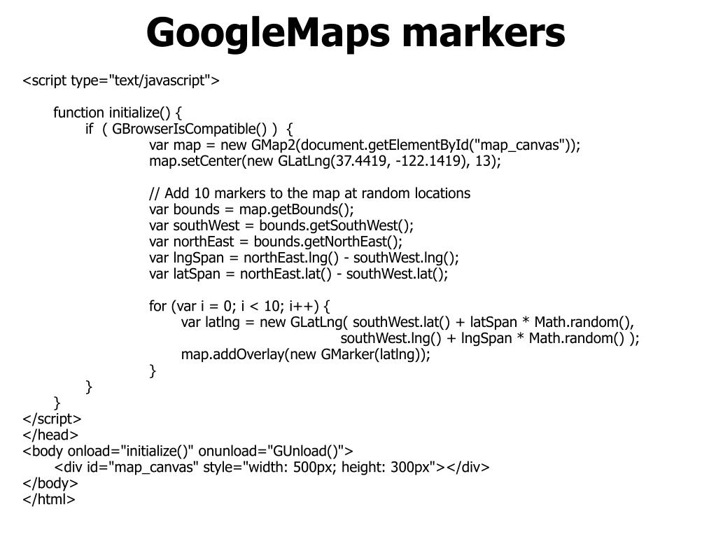 GoogleMaps markers <script type="text/javascript"> function initialize() { if ( GBrowserIsCompatible() ) { var map = new GMap2(document.getElementById("map_canvas")); map.setCenter(new GLatLng(37.4419, -122.1419), 13); // Add 10 markers to the map at random locations var bounds = map.getBounds(); var southWest = bounds.getSouthWest(); var northEast = bounds.getNorthEast(); var lngSpan = northEast.lng() - southWest.lng(); var latSpan = northEast.lat() - southWest.lat(); for (var i = 0; i < 10; i++) { var latlng = new GLatLng( southWest.lat() + latSpan * Math.random(), southWest.lng() + lngSpan * Math.random() ); map.addOverlay(new GMarker(latlng)); } } } </script> </head> <body onload="initialize()" onunload="GUnload()"> <div id="map_canvas" style="width: 500px; height: 300px"></div> </body> </html>