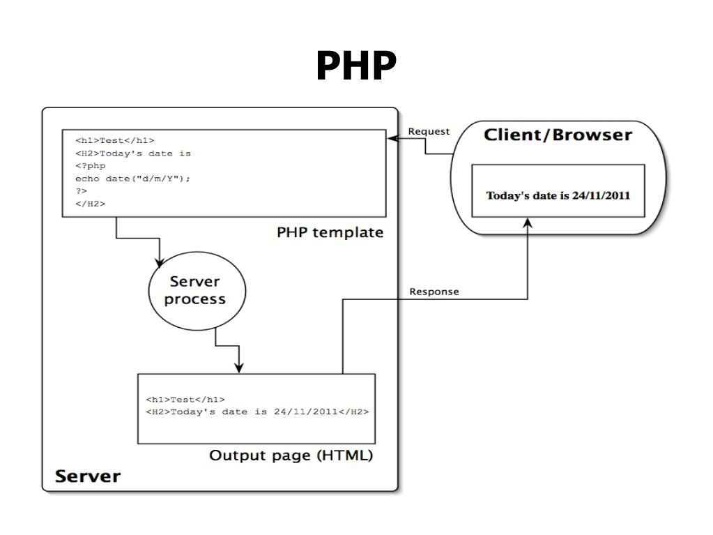 - server-side scripting language • can be embedded to a HTML page • is interpreted at the server • generates HTML and can be embedded in it • requires PHP extension for website PHP <html> <body> <h1>Hello!</h1> <?php echo "Hello World!"; ?> </body></html>