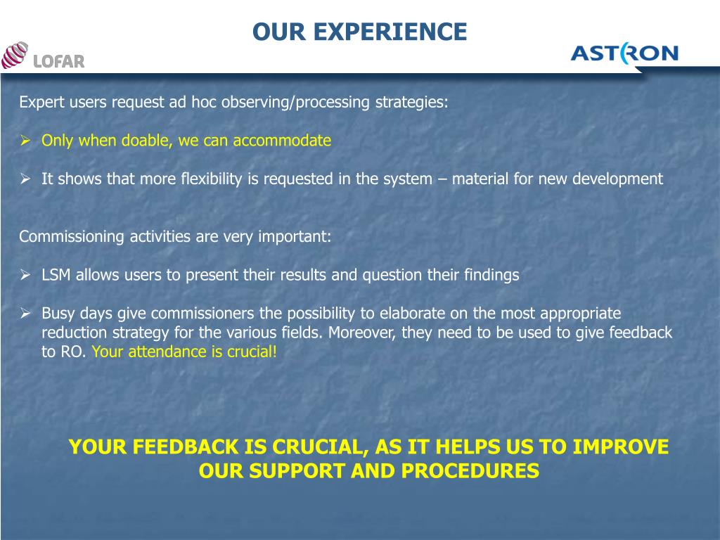 OUR EXPERIENCE • Expert users request ad hoc observing/processing strategies: • Only when doable, we can accommodate • It shows that more flexibility is requested in the system – material for new development • Commissioning activities are very important: • LSM allows users to present their results and question their findings • Busy days give commissioners the possibility to elaborate on the most appropriate reduction strategy for the various fields. Moreover, they need to be used to give feedback to RO. Your attendance is crucial! YOUR FEEDBACK IS CRUCIAL, AS IT HELPS US TO IMPROVE OUR SUPPORT AND PROCEDURES
