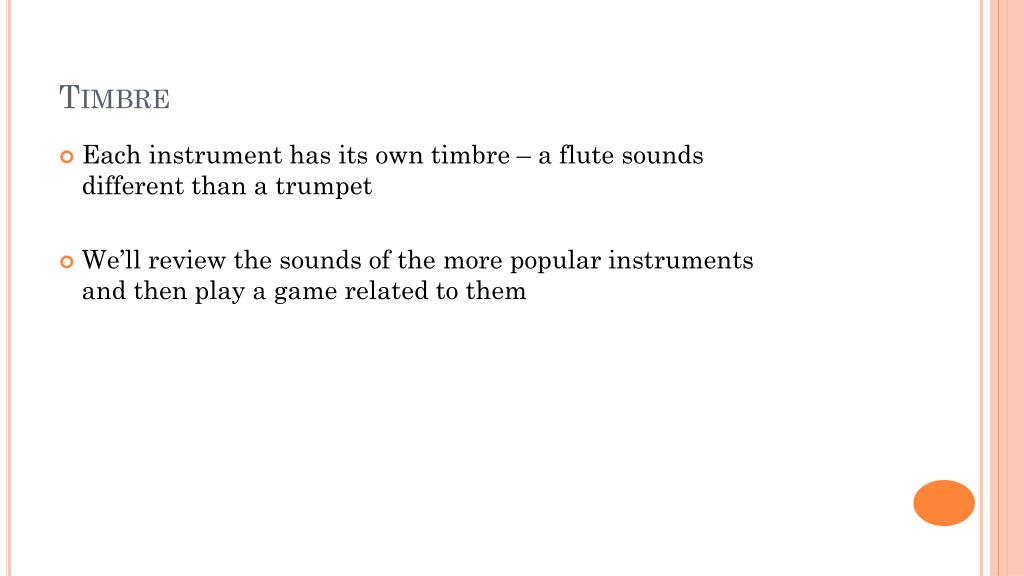 Timbre • Each instrument has its own timbre – a flute sounds different than a trumpet • We’ll review the sounds of the more popular instruments and then play a game related to them