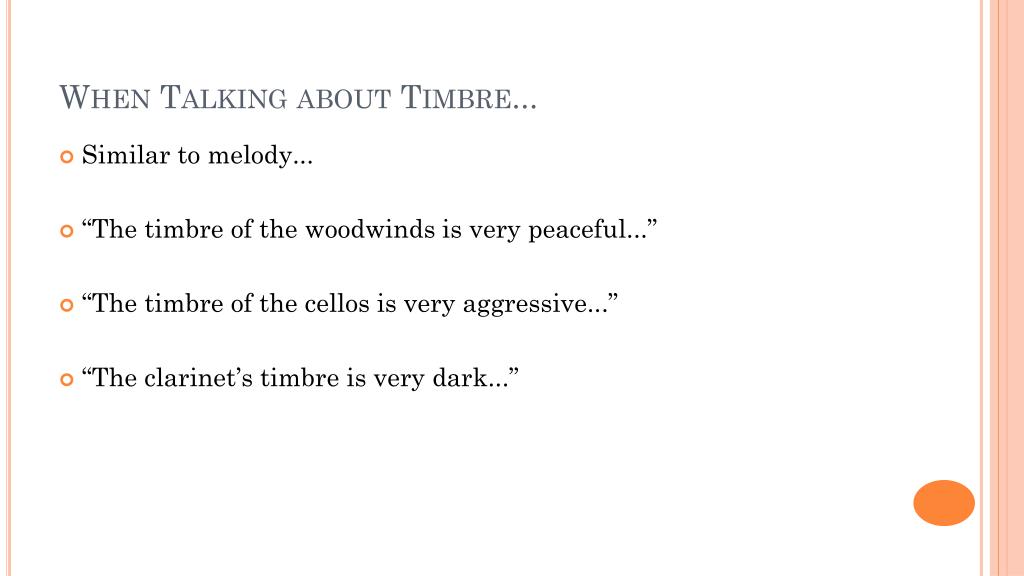 When Talking about Timbre... • Similar to melody... • “The timbre of the woodwinds is very peaceful...” • “The timbre of the cellos is very aggressive...” • “The clarinet’s timbre is very dark...”