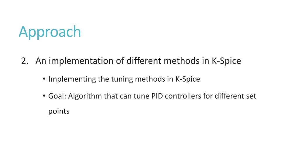 Approach • 2. An implementation of different methods in K-Spice • Implementing the tuning methods in K-Spice • Goal: Algorithm that can tune PID controllers for different set points