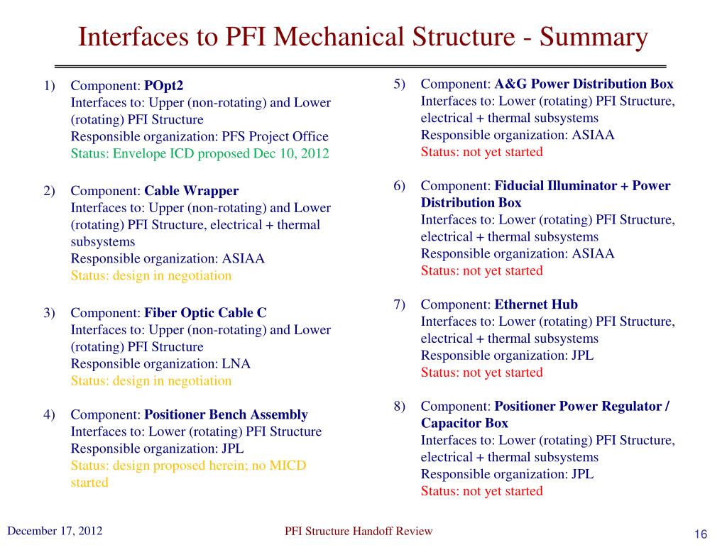 Interfaces to PFI Mechanical Structure – Summary cont’d Component: Thermal Subsystem Interfaces to: Lower (rotating) PFI StructureResponsible organization: ASIAAStatus: not yet started PFI Structure Handoff Review