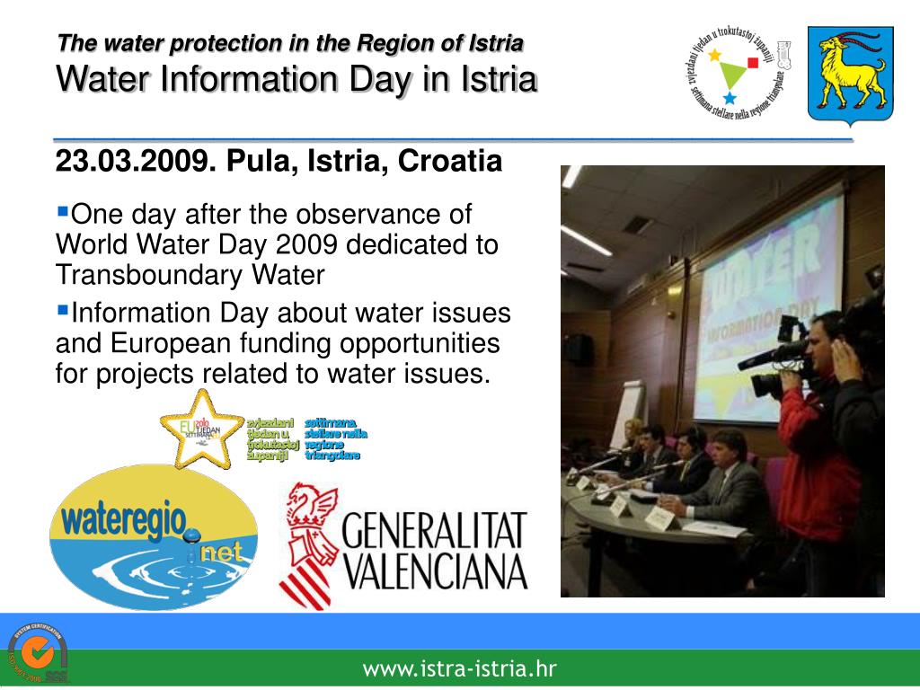 The water protection in the Region of IstriaWater Information Day in Istria________________________________________ • 23.03.2009. Pula, Istria, Croatia • One day after the observance of World Water Day 2009 dedicated to Transboundary Water • Information Day about water issues and European funding opportunities for projects related to water issues. www.istra-istria.hr