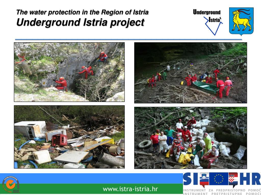The water protection in the Region of IstriaUnderground Istria project________________________________________ • Improving the state of environment and environmental conditions through an active approach to the protection of natural values in the border area; • Strengthening capacities, cooperation and coordinated action of all institutions in the field of environmental protection in the region; • Protection of underground waters and drinking water sources from pollution; • Raising the level of awareness of local population. www.istra-istria.hr