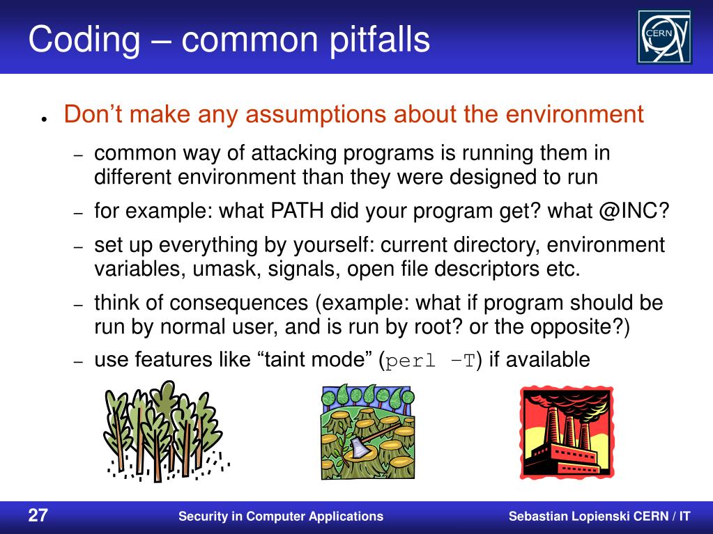 Coding – common pitfalls • Don’t make any assumptions about the environment • common way of attacking programs is running them in different environment than they were designed to run • for example: what PATH did your program get? what @INC? • set up everything by yourself: current directory, environment variables, umask, signals, open file descriptors etc. • think of consequences (example: what if program should be run by normal user, and is run by root? or the opposite?) • use features like “taint mode” (perl –T) if available
