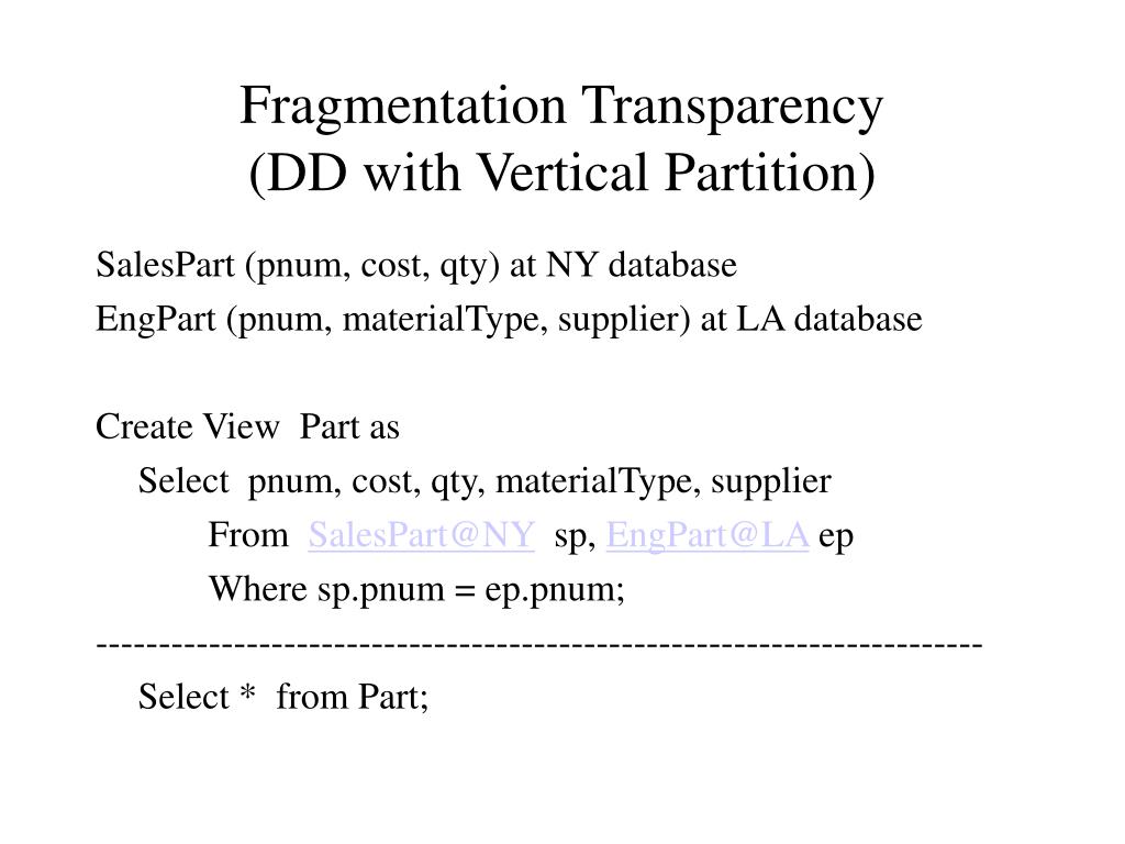 Fragmentation Transparency(DD with Vertical Partition) SalesPart (pnum, cost, qty) at NY database EngPart (pnum, materialType, supplier) at LA database Create View Part as Select pnum, cost, qty, materialType, supplier From SalesPart@NY sp, EngPart@LA ep Where sp.pnum = ep.pnum; ----------------------------------------------------------------------- Select * from Part;