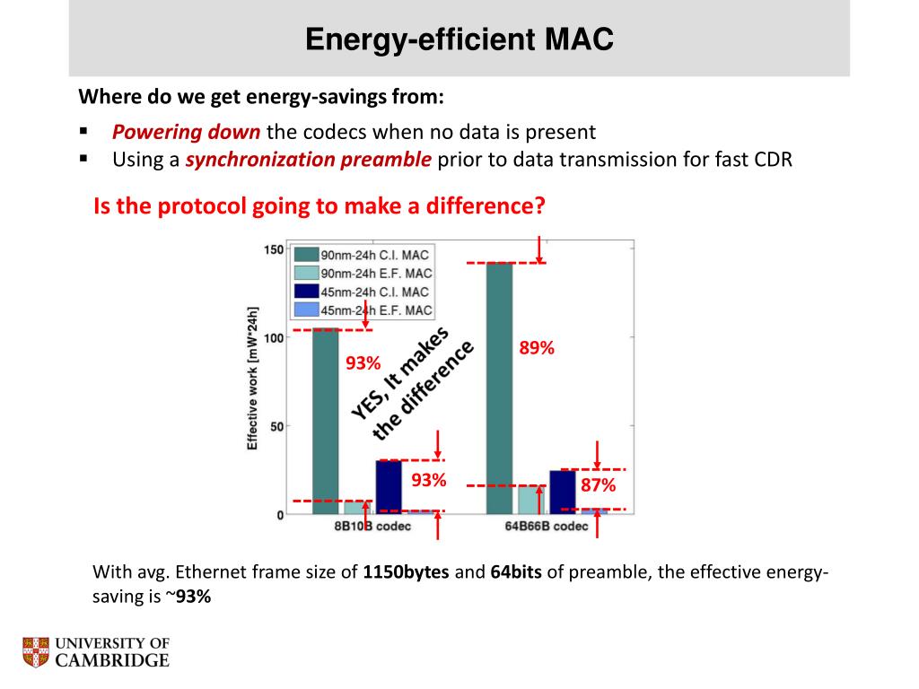 Energy-efficient MAC • Where do we get energy-savings from: • Powering down thecodecs when no data is present • Using a synchronization preamble prior to data transmission for fast CDR Is the protocol going to make a difference? 89% 93% YES, It makes the difference 93% 87% With avg. Ethernet frame size of 1150bytesand 64bits of preamble, the effective energy-saving is ~93%
