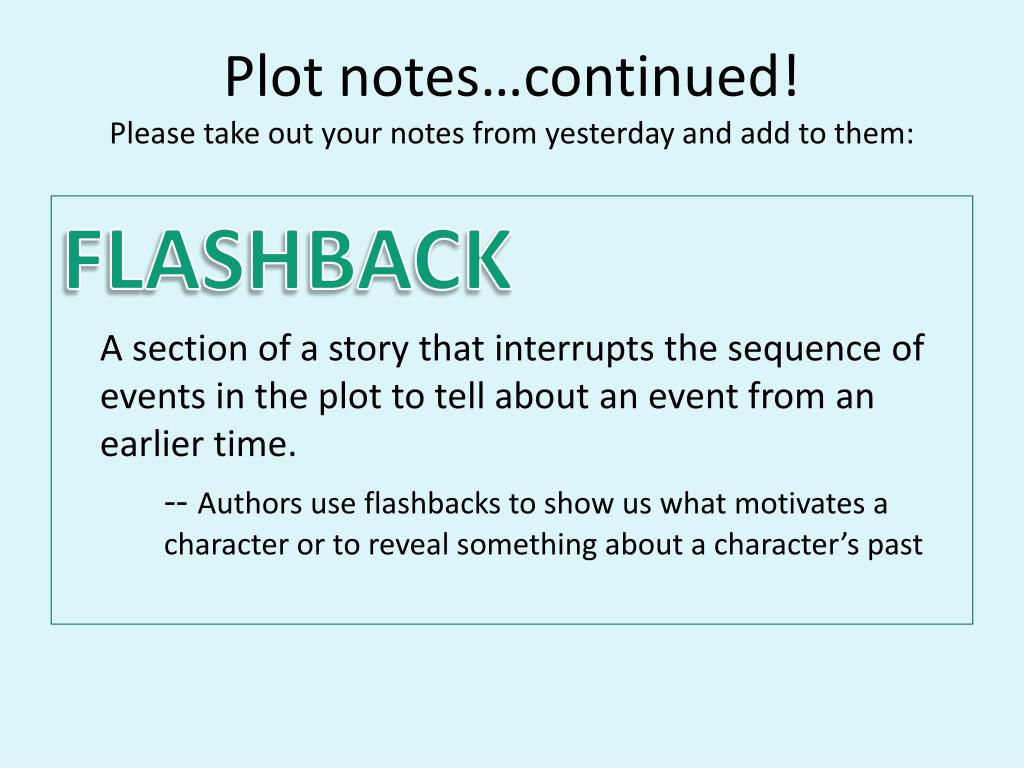Plot notes…continued!Please take out your notes from yesterday and add to them: FLASHBACK A section of a story that interrupts the sequence of events in the plot to tell about an event from an earlier time. -- Authors use flashbacks to show us what motivates a character or to reveal something about a character’s past