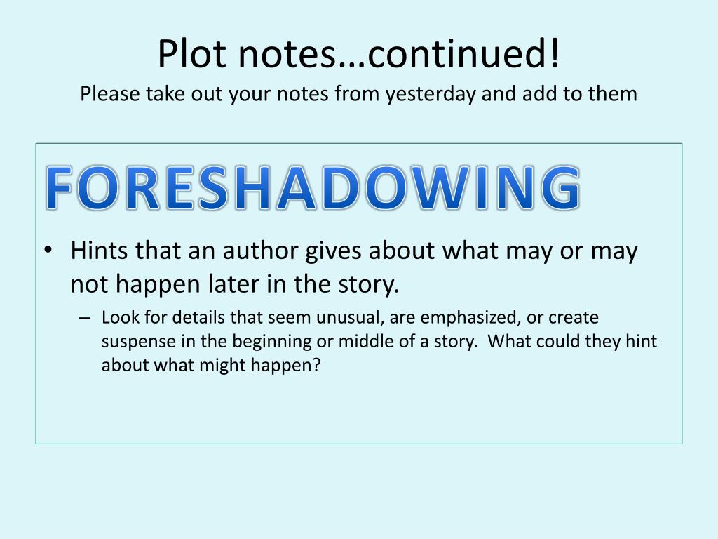 Plot notes…continued!Please take out your notes from yesterday and add to them FORESHADOWING • Hints that an author gives about what may or may not happen later in the story. • Look for details that seem unusual, are emphasized, or create suspense in the beginning or middle of a story. What could they hint about what might happen?