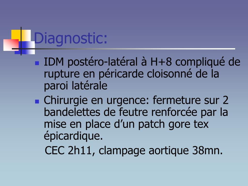 Diagnostic: • IDM postéro-latéral à H+8 compliqué de rupture en péricarde cloisonné de la paroi latérale • Chirurgie en urgence: fermeture sur 2 bandelettes de feutre renforcée par la mise en place d’un patch gore tex épicardique. CEC 2h11, clampage aortique 38mn.