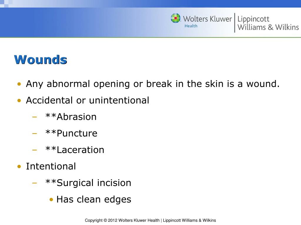 Wounds • Any abnormal opening or break in the skin is a wound. • Accidental or unintentional • **Abrasion • **Puncture • **Laceration • Intentional • **Surgical incision • Has clean edges