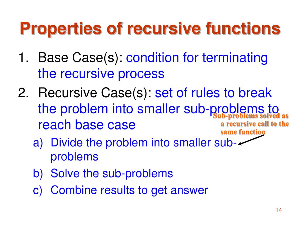 Properties of recursive functions • Base Case(s): condition for terminating the recursive process • Recursive Case(s): set of rules to break the problem into smaller sub-problems to reach base case • Divide the problem into smaller sub-problems • Solve the sub-problems • Combine results to get answer Sub-problems solved as a recursive call to the same function