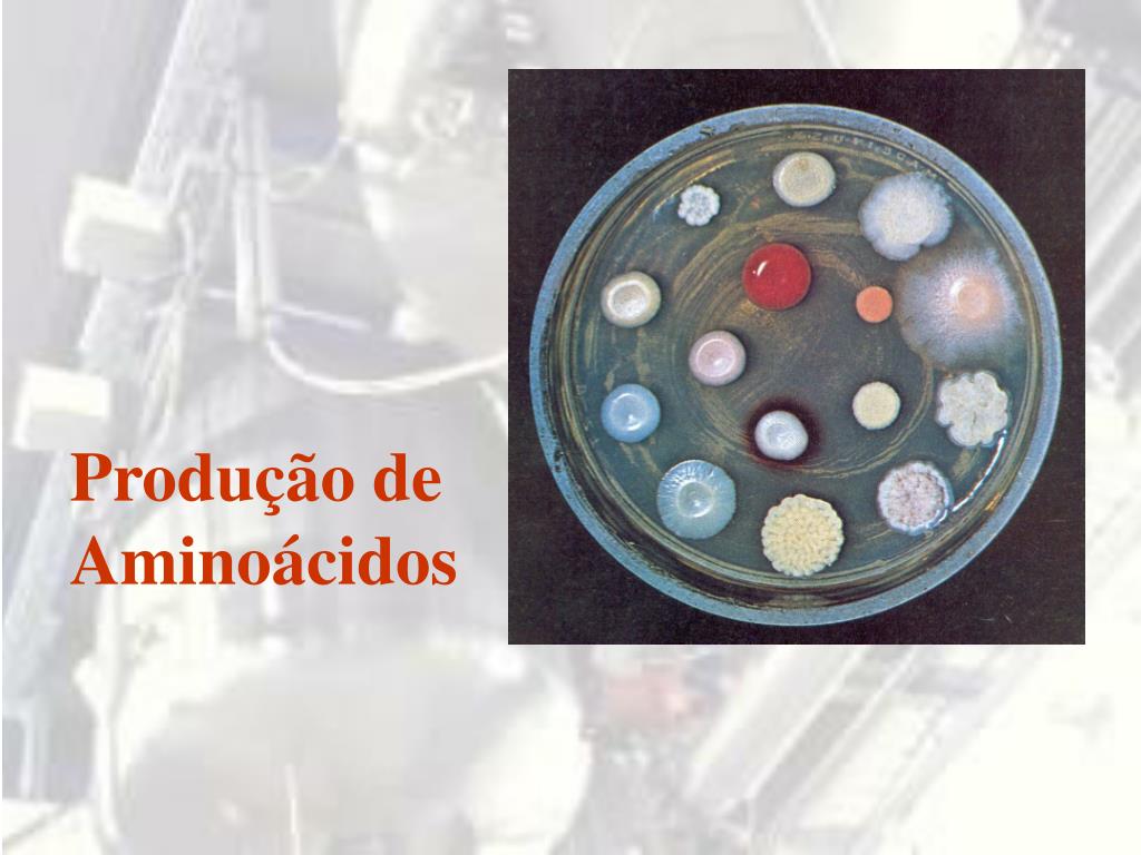 Produção de Aminoácidos • Interessam apenas a-L-aminoácidos • vantagem da síntese microbiológica • desvantagem: vias de síntese altamente reguladas • Alto consumo energético. COOH • nutrição humana e animal • agentes flavorizantes • cosméticos • medicamentos • alimentação intravenosa H2N H ala Movimenta US $1,9 bilhões anuais CH3