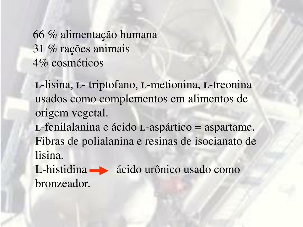66 % alimentação humana 31 % rações animais 4% cosméticos L-lisina, L- triptofano, L-metionina, L-treonina usados como complementos em alimentos de origem vegetal. L-fenilalanina e ácido L-aspártico = aspartame. Fibras de polialanina e resinas de isocianato de lisina. L-histidina ácido urônico usado como bronzeador.