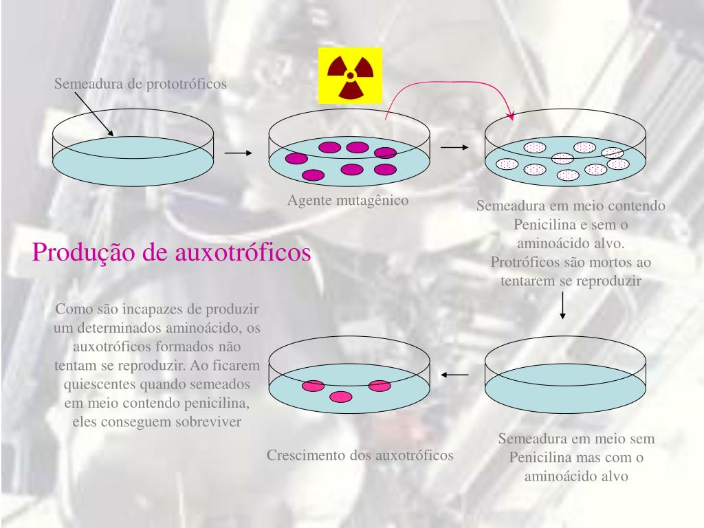 Semeadura de prototróficos Agente mutagênico Semeadura em meio contendo Penicilina e sem o aminoácido alvo. Protróficos são mortos ao tentarem se reproduzir Produção de auxotróficos Como são incapazes de produzir um determinados aminoácido, os auxotróficos formados não tentam se reproduzir. Ao ficarem quiescentes quando semeados em meio contendo penicilina, eles conseguem sobreviver Semeadura em meio sem Penicilina mas com o aminoácido alvo Crescimento dos auxotróficos