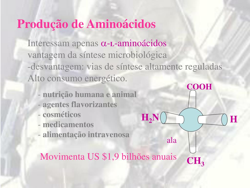 Produção de Aminoácidos. Produção de Aminoácidos. Interessam apenas a - L -aminoácidos vantagem da síntese microbiológica desvantagem: vias de síntese altamente reguladas Alto consumo energético. COOH. nutrição humana e animal agentes flavorizantes cosméticos medicamentos